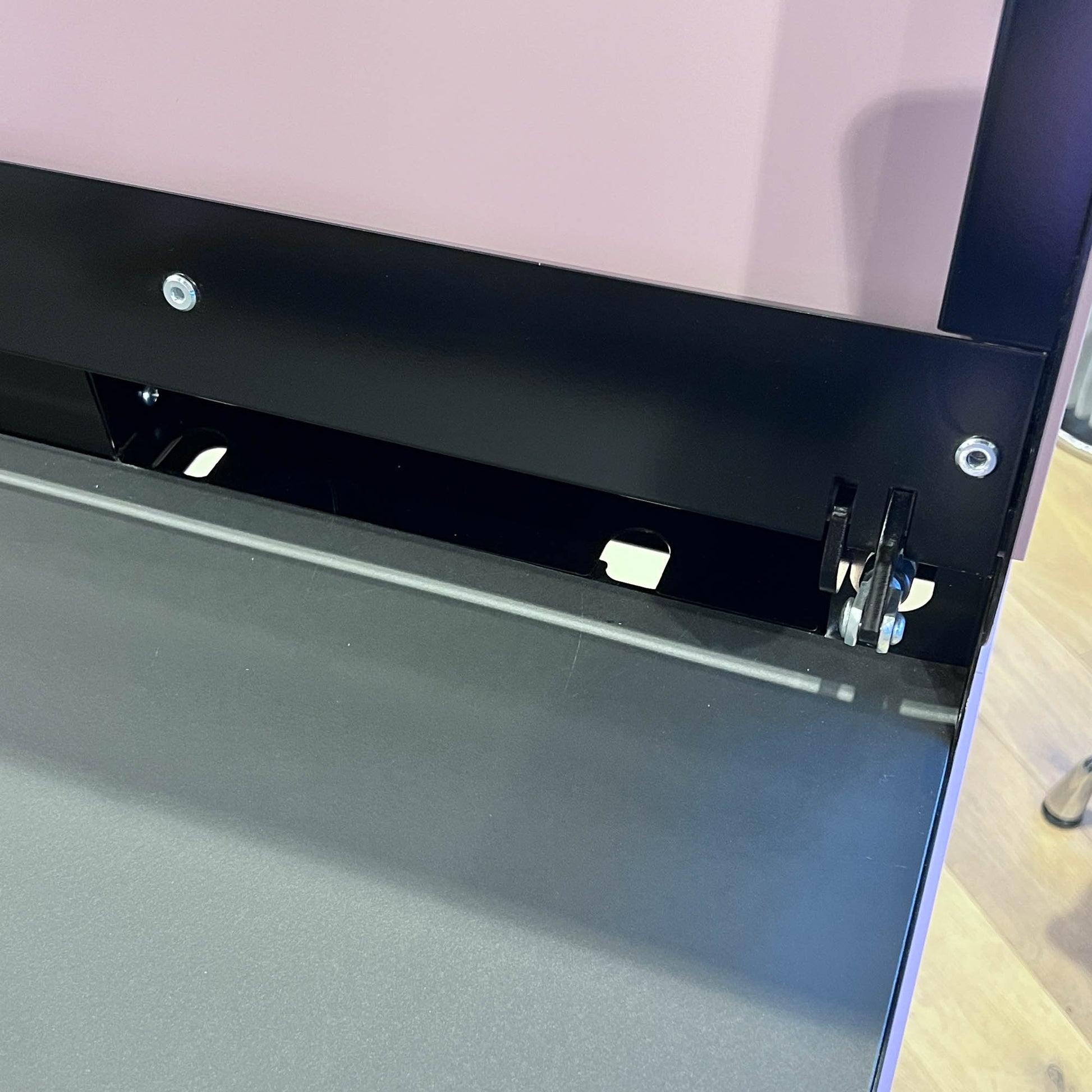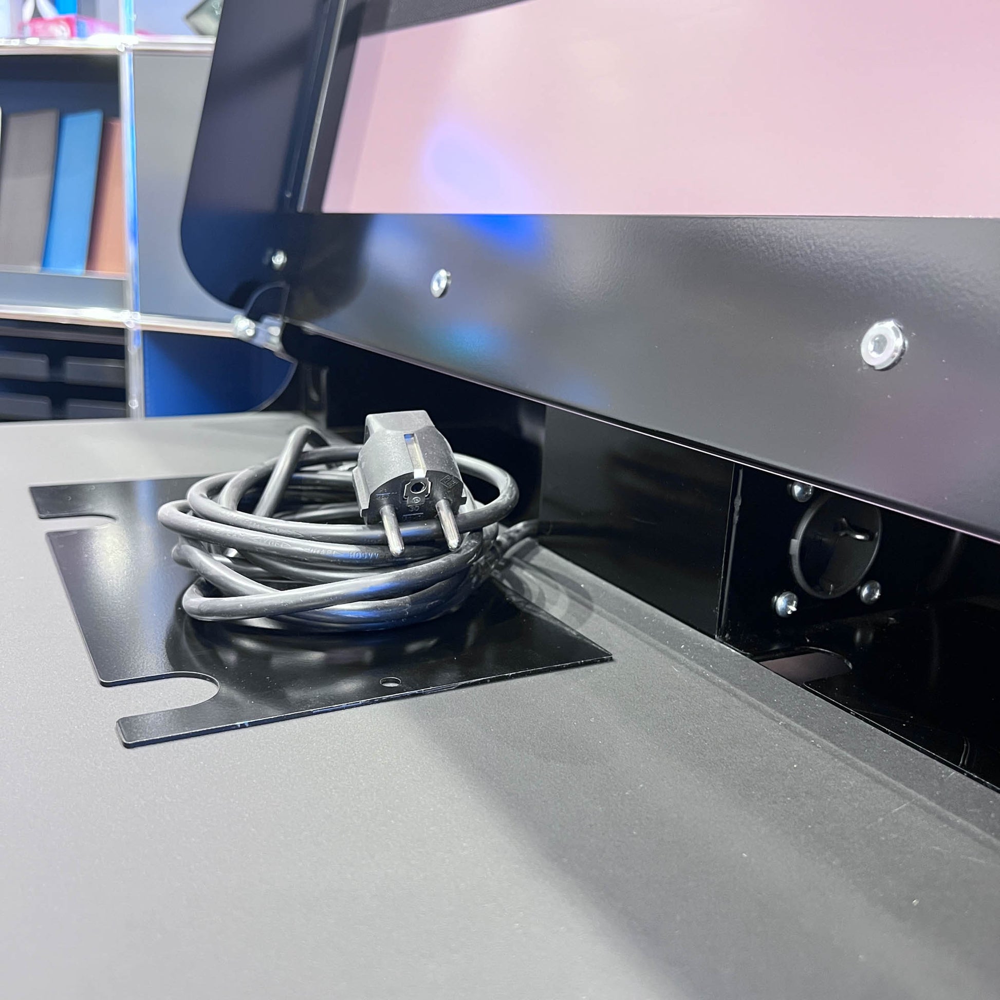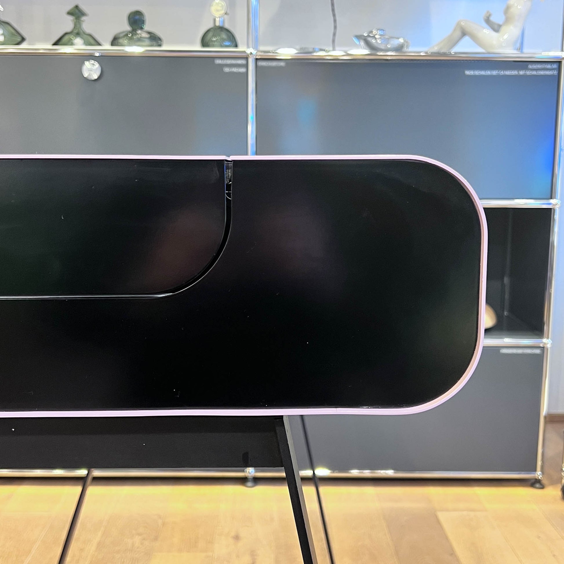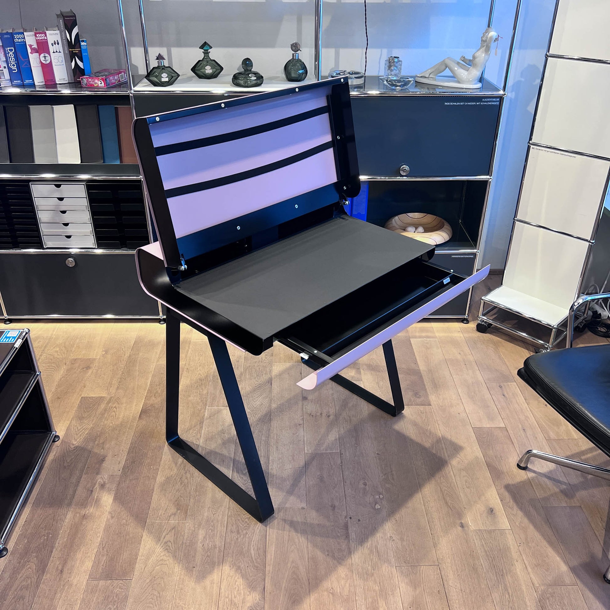 Beschreibung: Klappdeckel aus Metall, Schublade mit Fächer, eingebaute Steckerbuchse (DE). Smart, platzsparend und praktisch